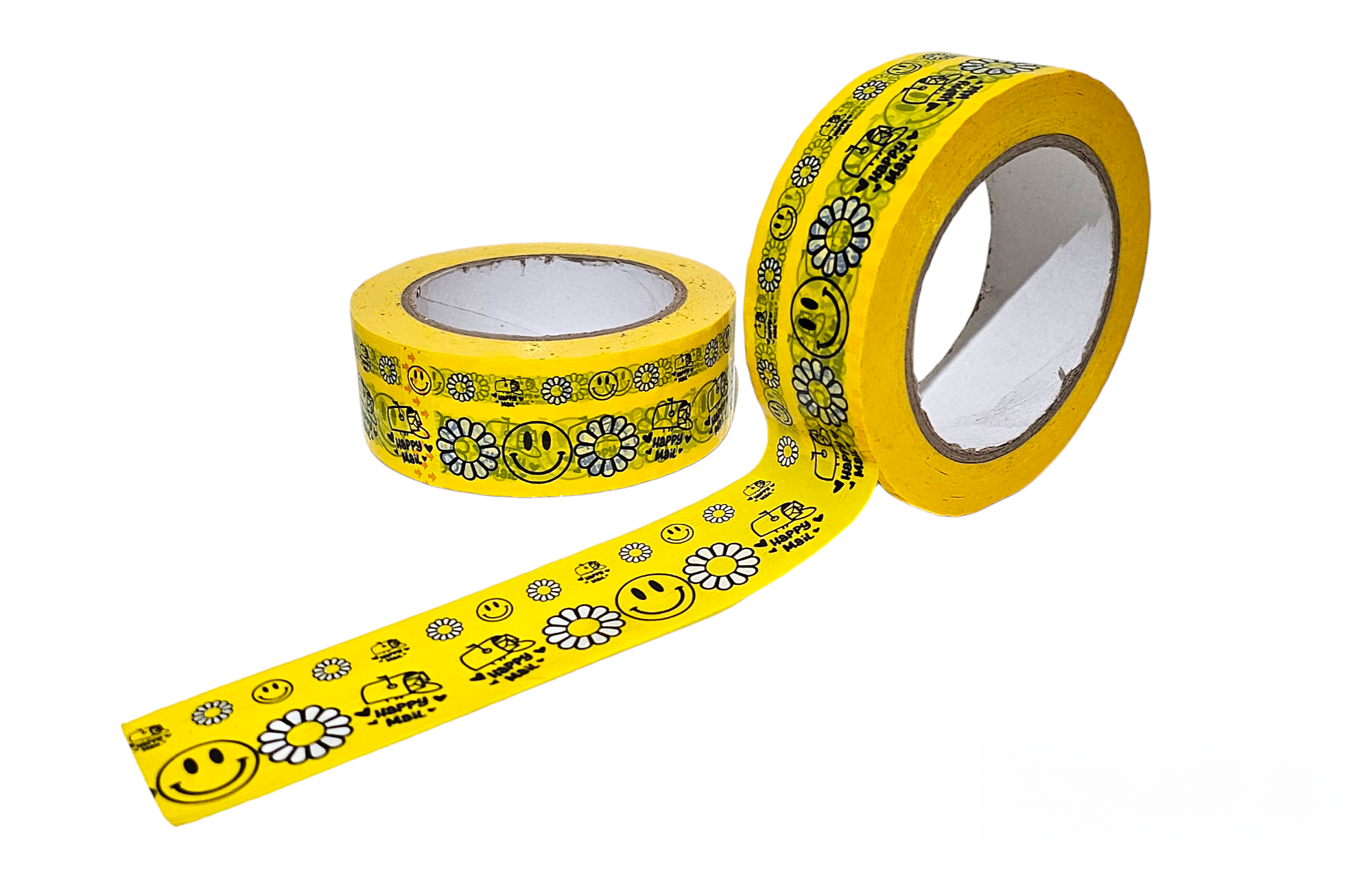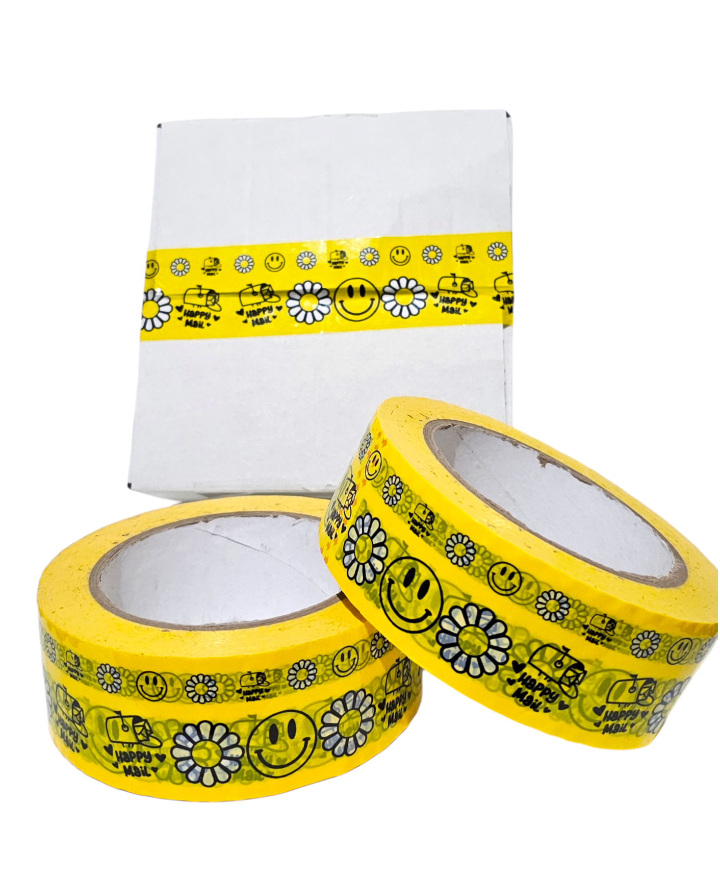 This cute packaging tape features a bright yellow print with Smileys, Daisies and Happy Mail. This will surely stand out and create a delightful unboxing experience for your customers or friends.